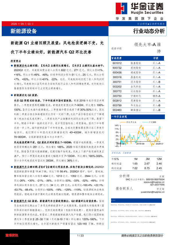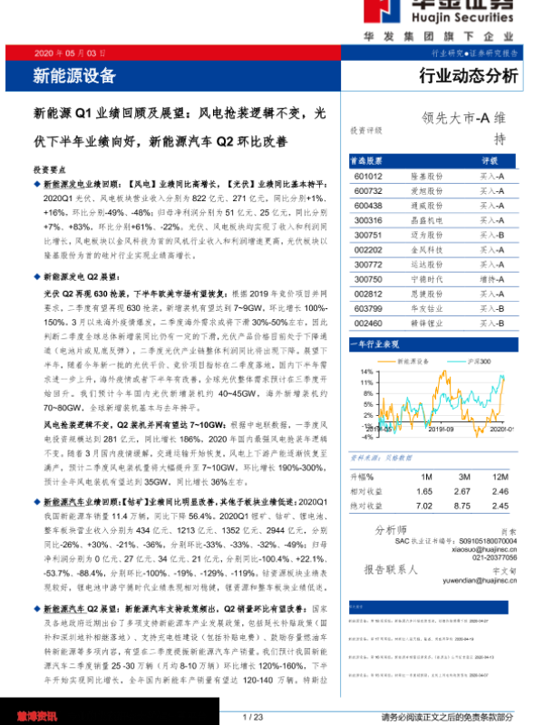 【华金证券】【20200503】新能源Q1业绩回顾及展望:风电抢装逻辑不变,光伏下半年业绩向好,新能源汽车Q2环比改善-23页
