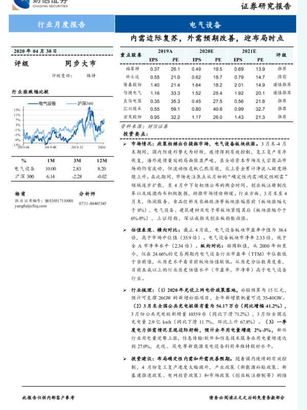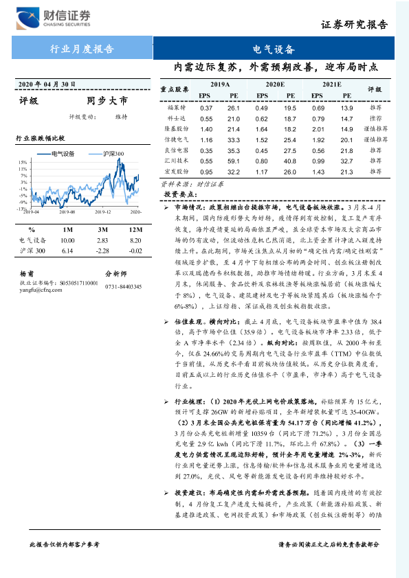 【财信证券】【20200430】电气设备行业月度报告:内需边际复苏,外需预期改善,迎布局时点-17页
