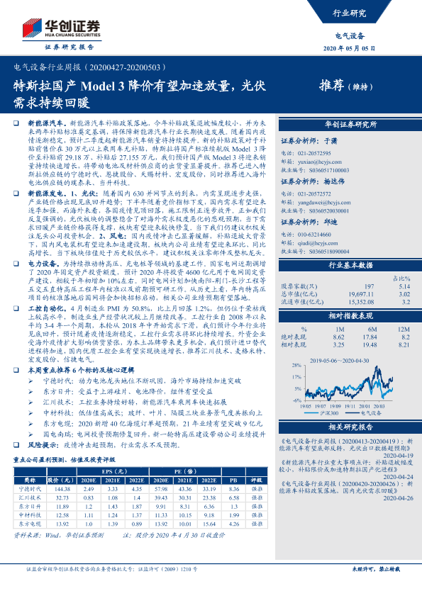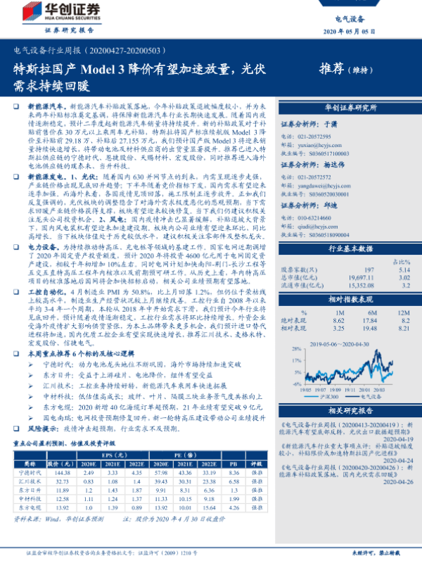 【华创证券】【20200505】电气设备行业周报:特斯拉国产Model3降价有望加速放量,光伏需求持续回暖-20页