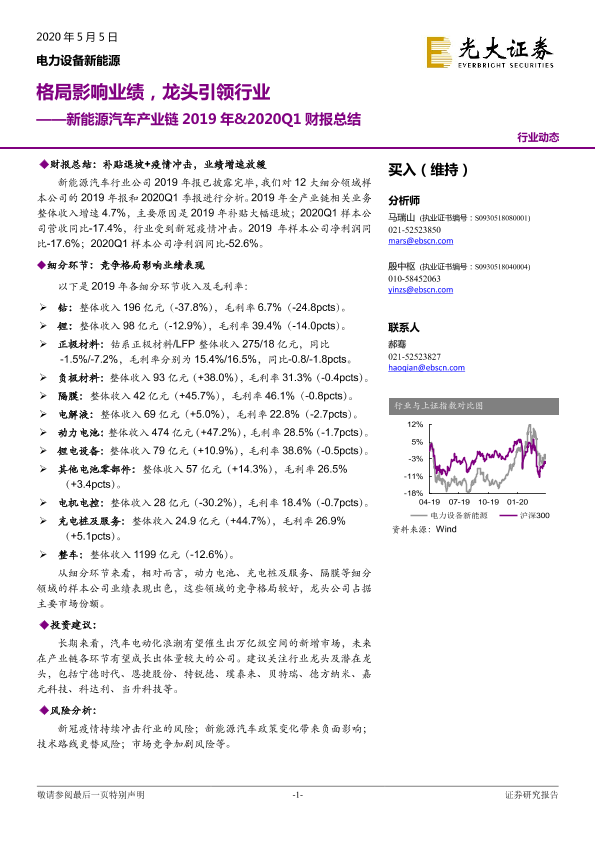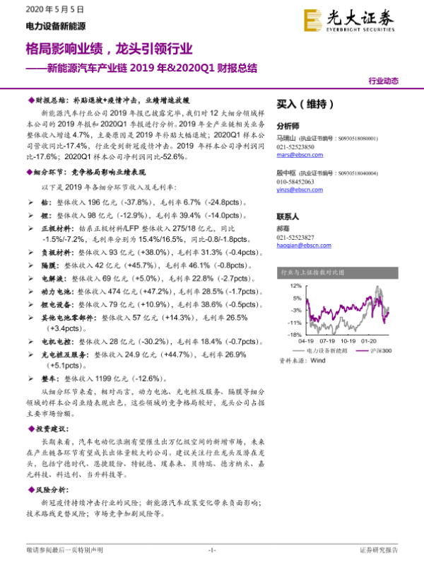 【光大证券】【20200505】新能源汽车产业链2019年&2020Q1财报总结:格局影响业绩,龙头引领行业-21页
