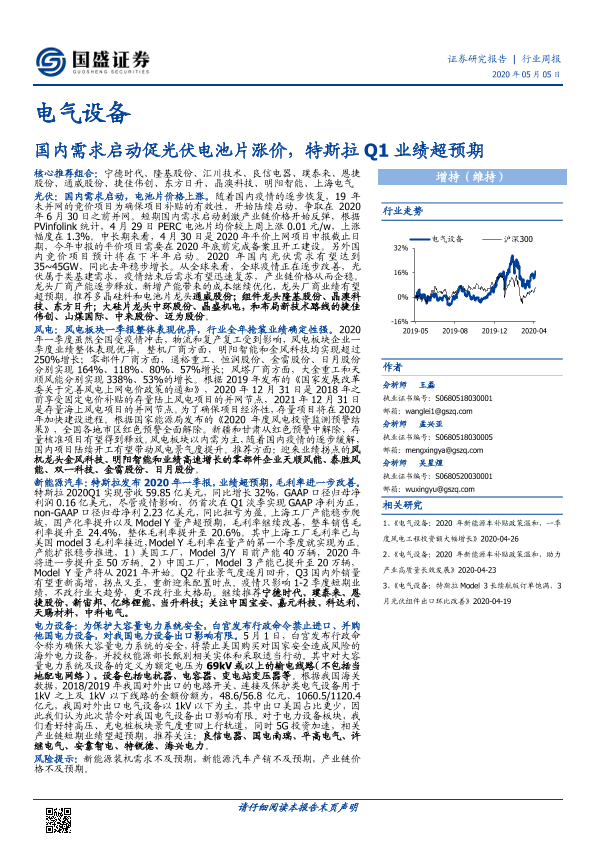 【国盛证券】【20200505】电气设备行业周报:国内需求启动促光伏电池片涨价,特斯拉Q1业绩超预期-16页