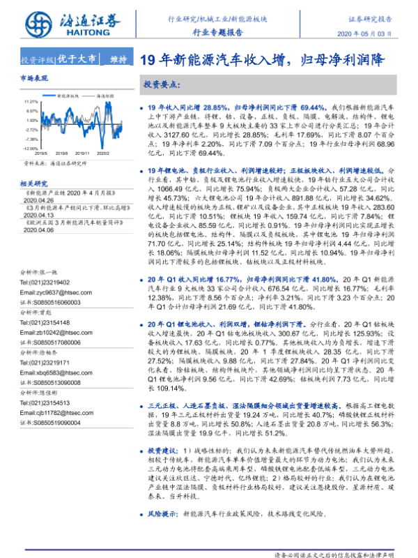【海通证券】【20200503】19年新能源汽车收入增,归母净利润降-21页