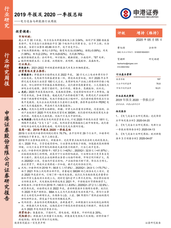 【申港证券】【20200505】2019年报及2020一季报总结——电力设备与新能源行业周报-43页
