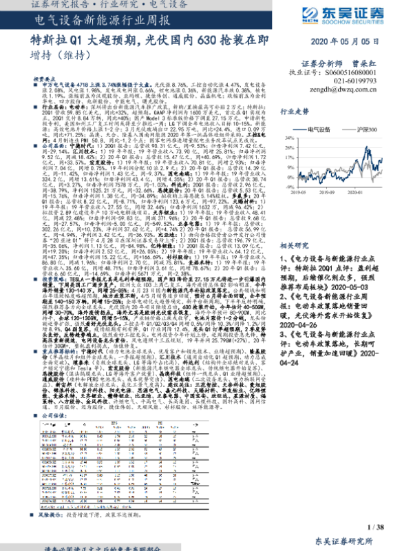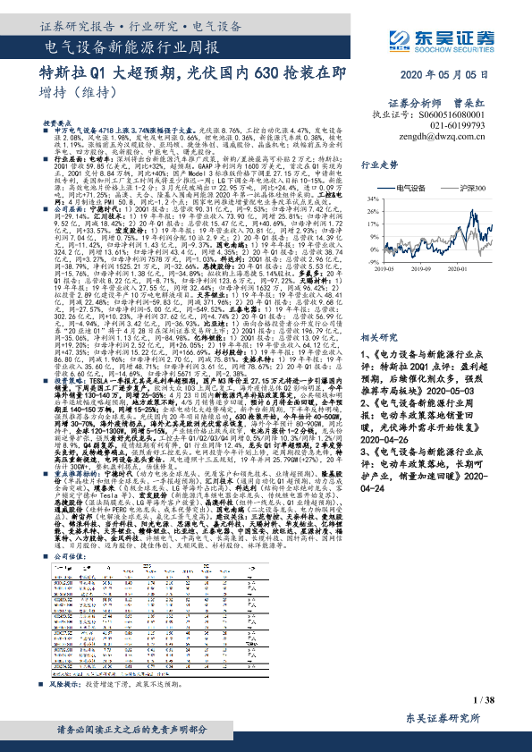 【东吴证券】【20200505】电气设备新能源行业周报:特斯拉Q1大超预期,光伏国内630抢装在即-38页