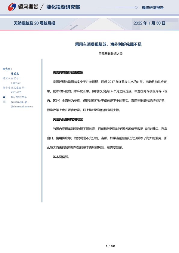 【银河期货】【20220130】天然橡胶及20号胶月报:呈现基础数据之美,乘用车消费现复苏,海外利好兑现不足-101页