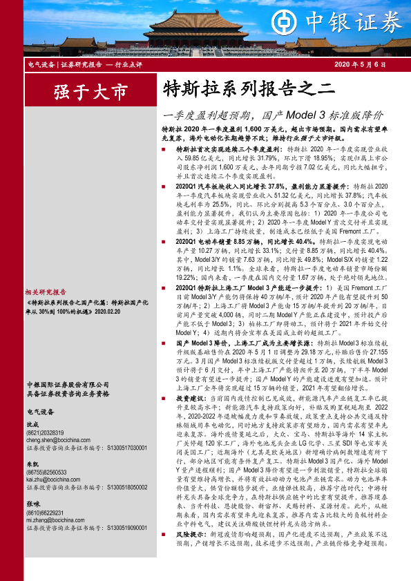 【中银证券】【20200506】特斯拉系列报告之二:一季度盈利超预期,国产Model 3标准版降价-11页