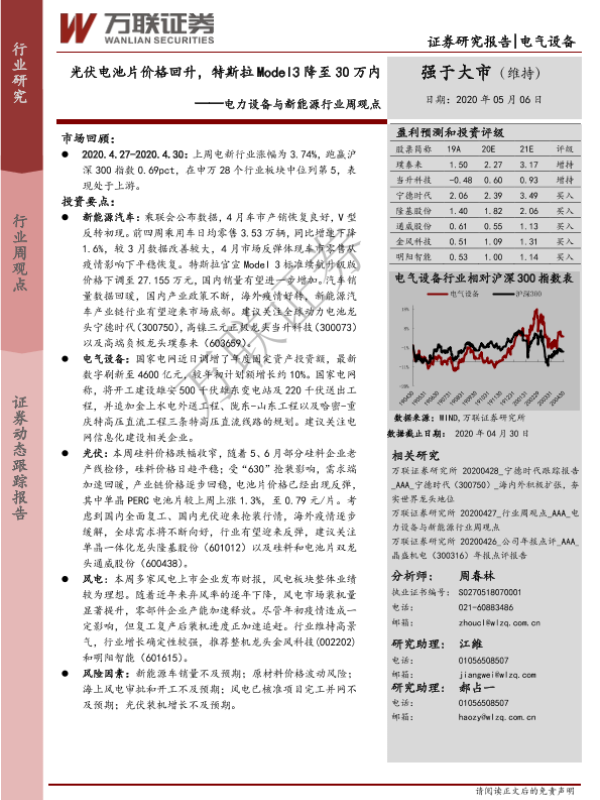 【万联证券】【20200506】电力设备与新能源行业周观点:光伏电池片价格回升,特斯拉Model3降至30万内-12页