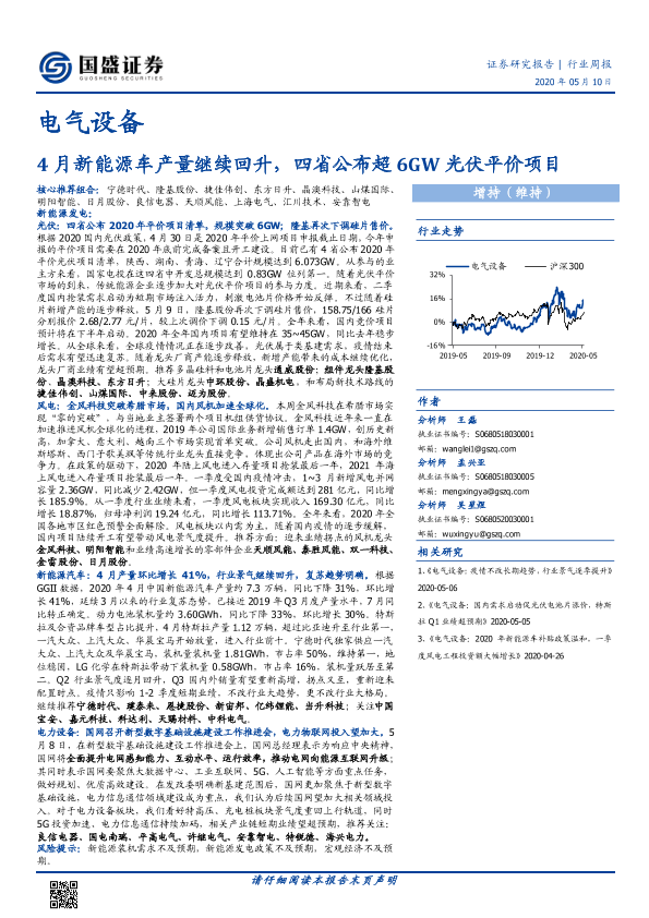 【国盛证券】【20200510】电气设备行业周报:4月新能源车产量继续回升,四省公布超6GW光伏平价项目-14页