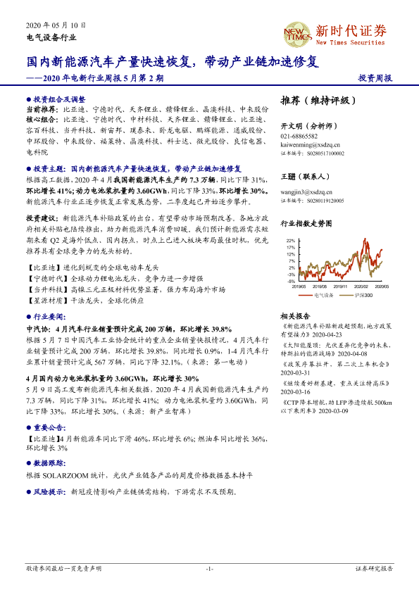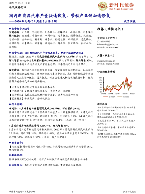 【新时代证券】【20200510】2020年电新行业周报5月第2期:国内新能源汽车产量快速恢复,带动产业链加速修复-12页