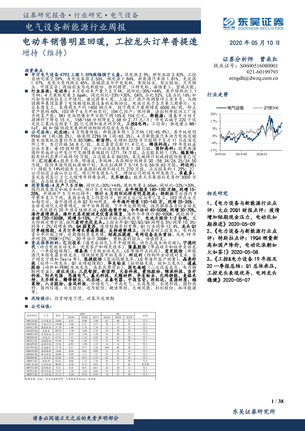 【东吴证券】【20200510】电气设备新能源行业周报:电动车销售明显回暖,工控龙头订单普提速-38页