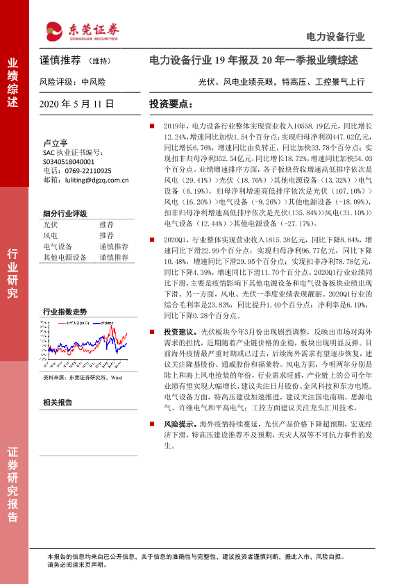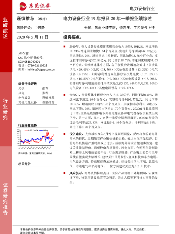 【东莞证券】【20200511】电力设备行业19年报及20年一季报业绩综述:光伏、风电业绩亮眼,特高压、工控景气上行-14页