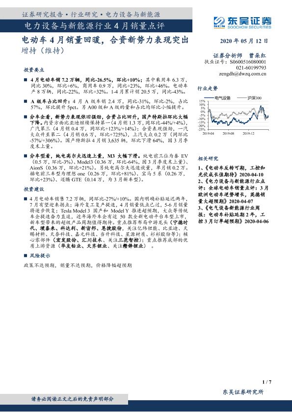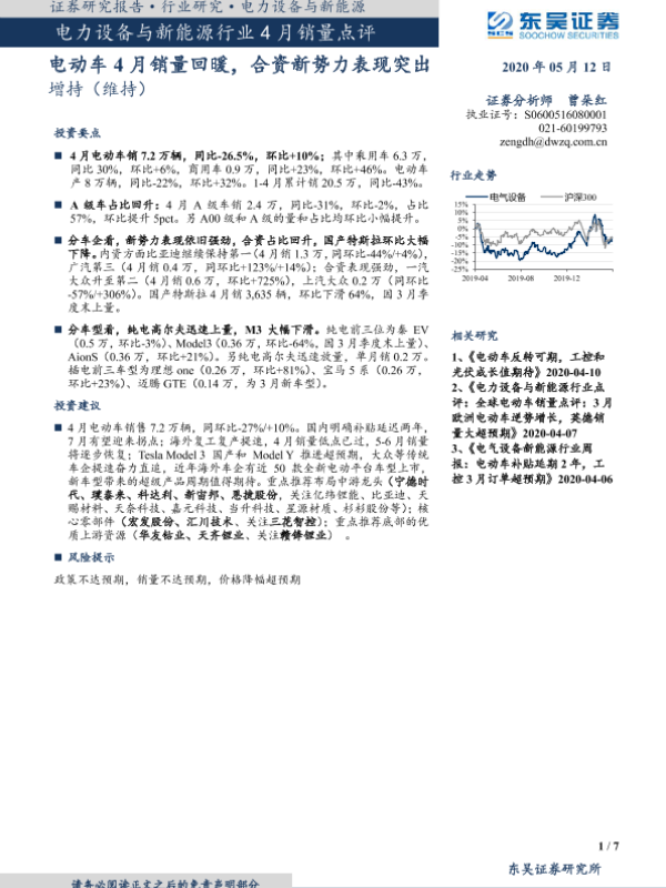 【东吴证券】【20200512】电力设备与新能源行业4月销量点评:电动车4月销量回暖,合资新势力表现突出-7页