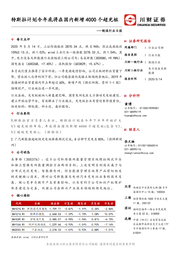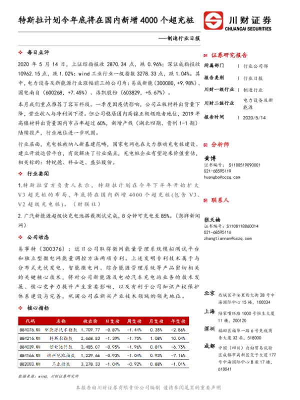 【川财证券】【20200514】制造行业日报:特斯拉计划今年底将在国内新增4000个超充桩-3页