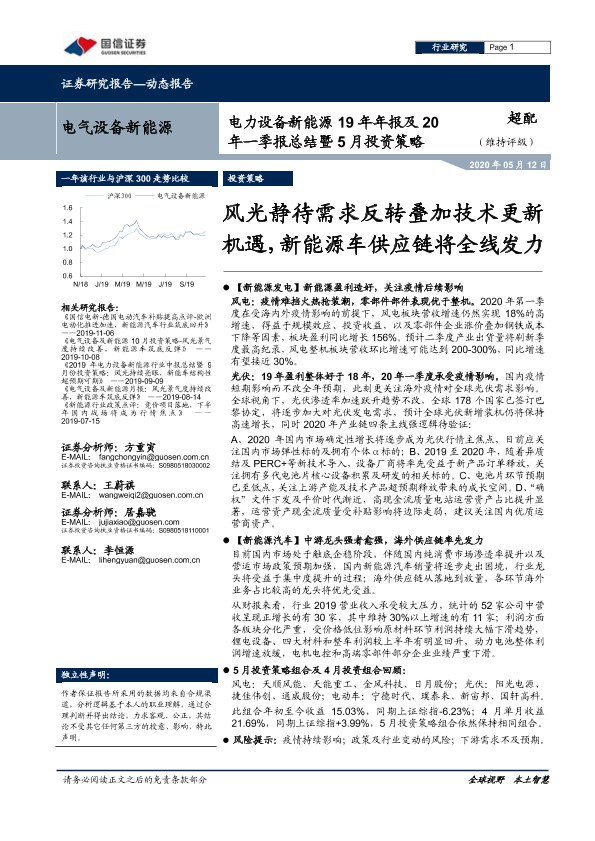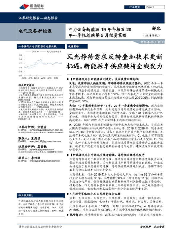 【国信证券】【20200512】电力设备新能源19年年报及20年一季报总结暨5月投资策略:风光静待需求反转叠加技术更新机遇,新能源车供应链将全线发力-25页