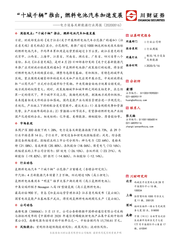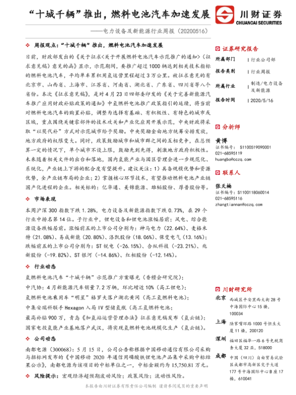 【川财证券】【20200516】电力设备及新能源行业周报:“十城千辆”推出,燃料电池汽车加速发展-16页