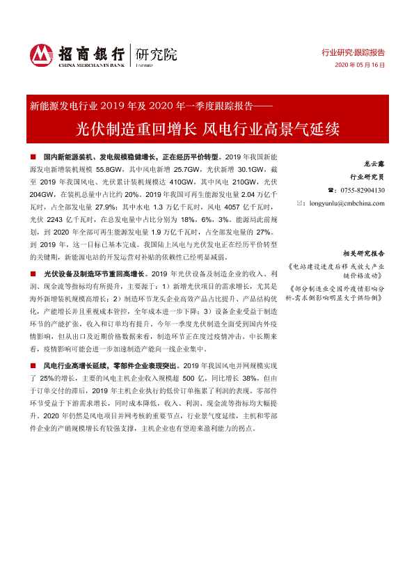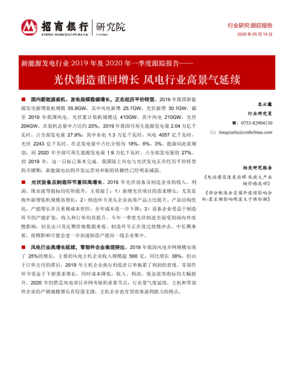 【招商银行】【20200516】新能源发电行业2019年及2020年一季度跟踪报告:光伏制造重回增长 风电行业高景气延续-16页
