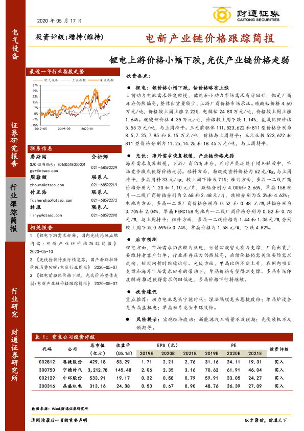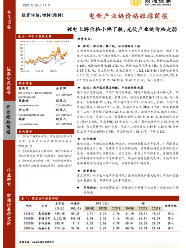 【财通证券】【20200517】电新产业链价格跟踪简报:锂电上游价格小幅下跌,光伏产业链价格走弱-10页