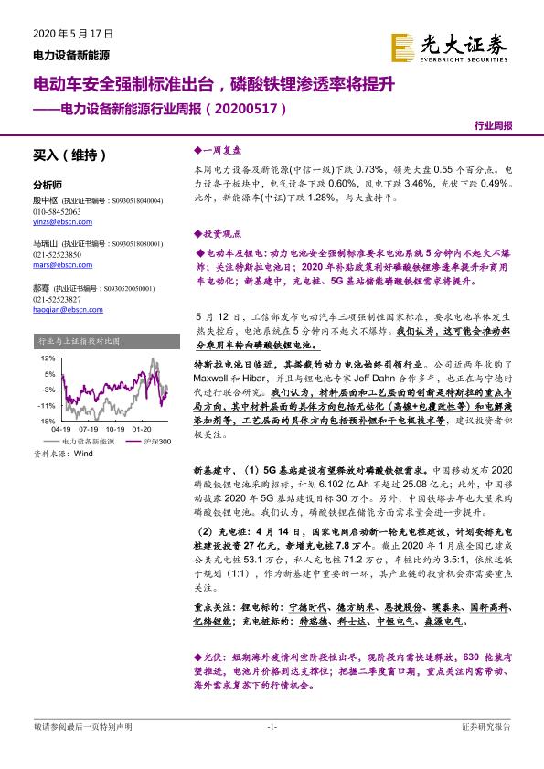 【光大证券】【20200517】电力设备新能源行业周报:电动车安全强制标准出台,磷酸铁锂渗透率将提升-36页
