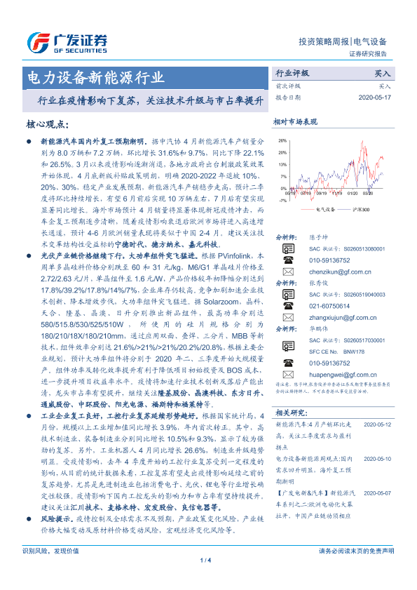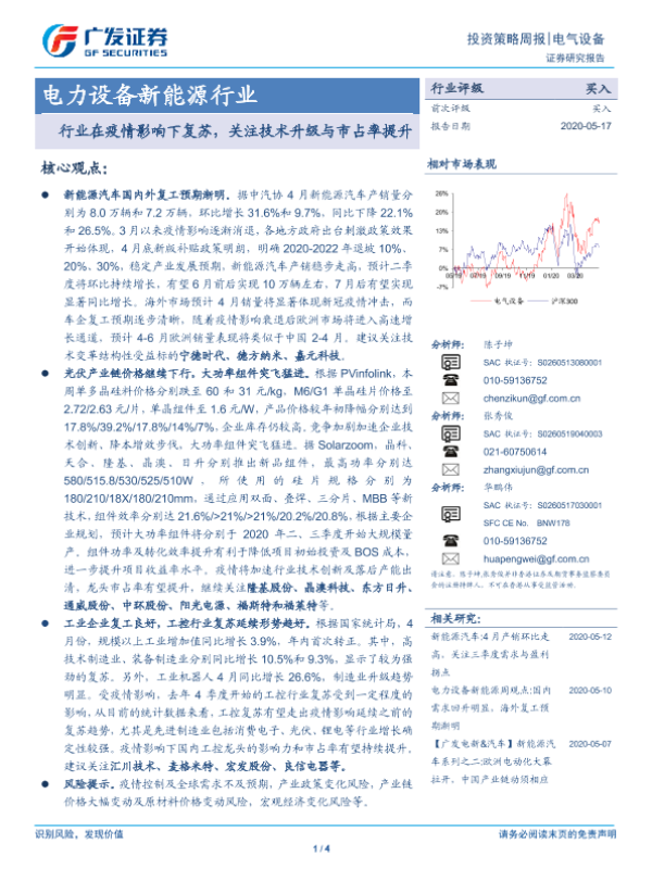 【广发证券】【20200517】电力设备新能源行业投资策略周报:行业在疫情影响下复苏,关注技术升级与市占率提升-4页