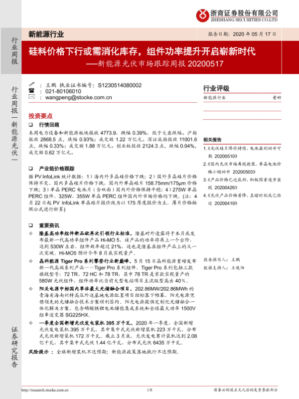 【浙商证券】【20200517】20200517-浙商证券-新能源光伏市场跟踪周报:硅料价格下行或需消化库存,组件功率提升开启崭新时代-8页