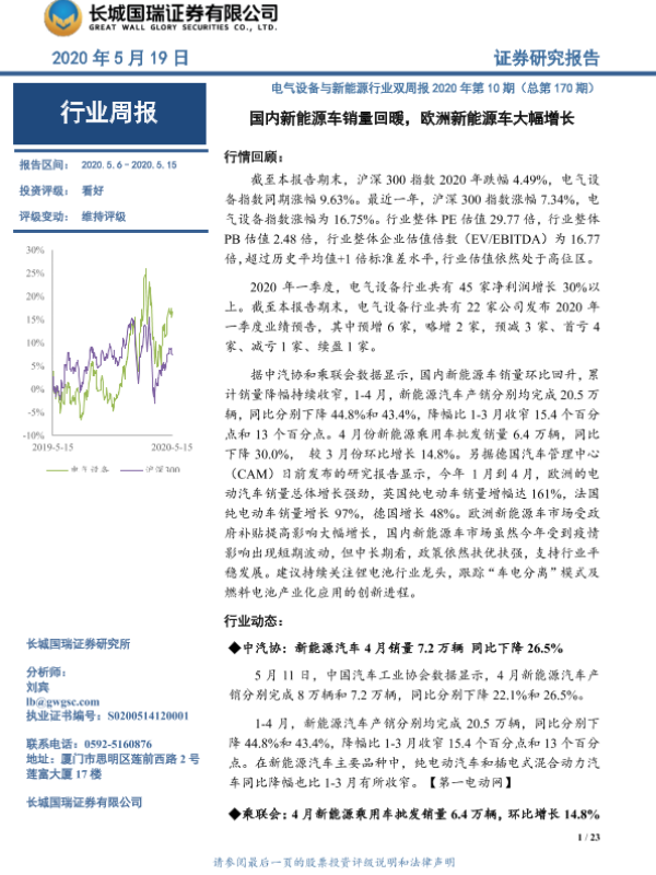 【长城国瑞证券】【20200519】国内新能源车销量回暖,欧洲新能源车大幅增长-23页
