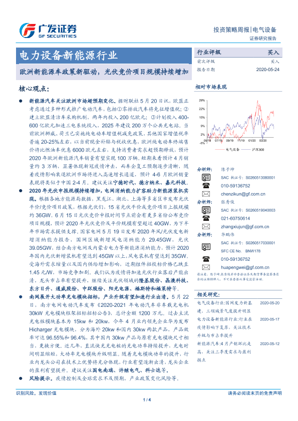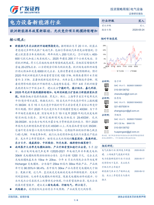 【广发证券】【20200524】电力设备新能源行业:欧洲新能源车政策新驱动,光伏竞价项目规模持续增加-4页