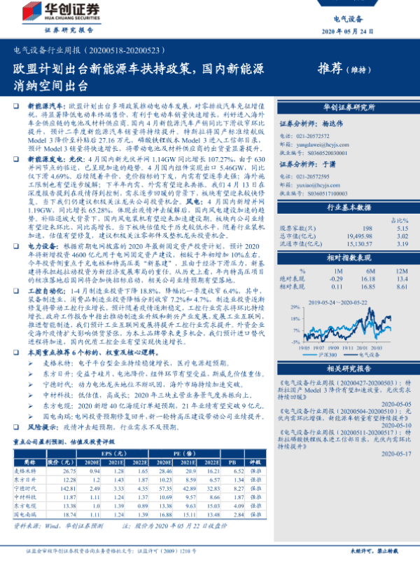 【华创证券】【20200524】电气设备行业周报:欧盟计划出台新能源车扶持政策,国内新能源消纳空间出台-21页