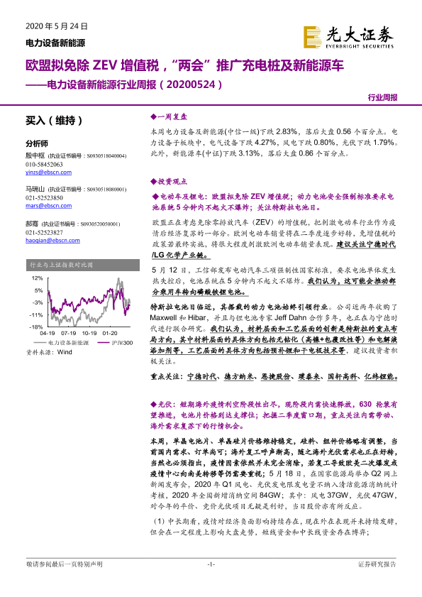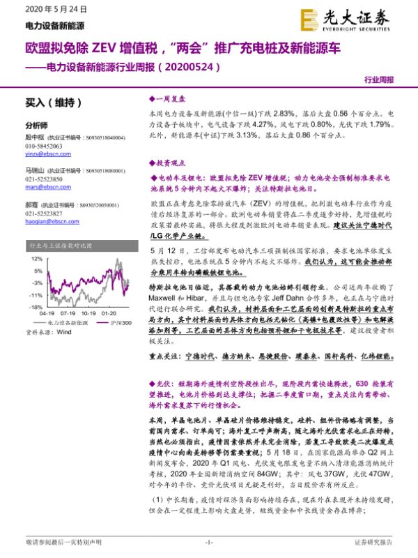 【光大证券】【20200524】电力设备新能源行业周报:欧盟拟免除ZEV增值税,“两会”推广充电桩及新能源车-33页