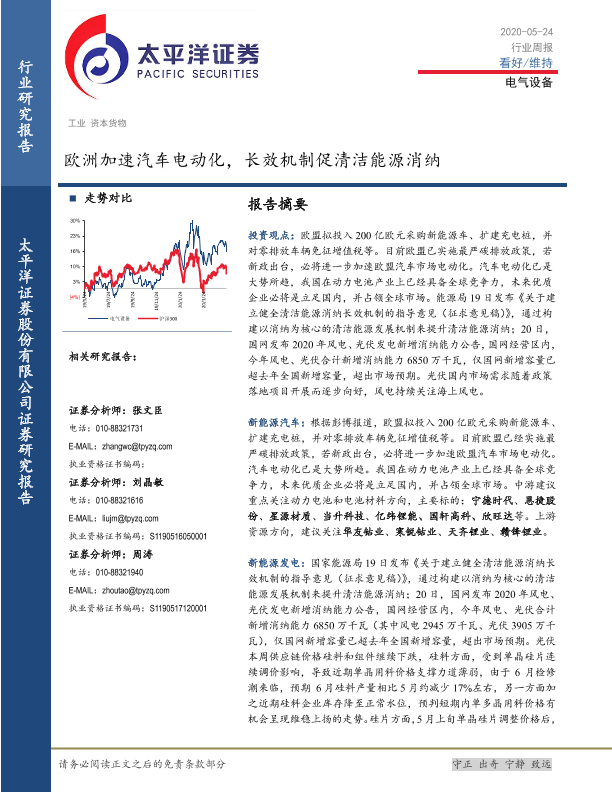 【太平洋证券】【20200524】电气设备行业周报:欧洲加速汽车电动化,长效机制促清洁能源消纳-18页