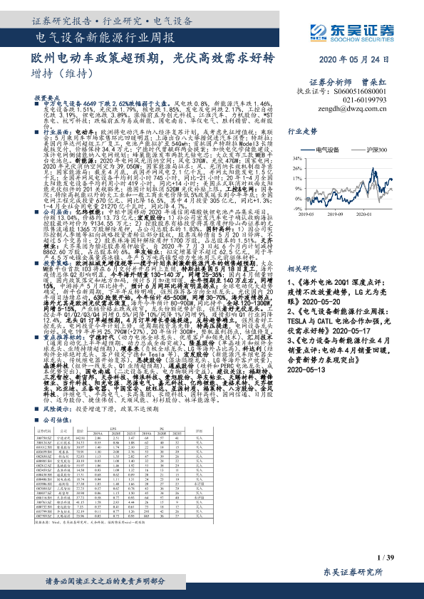 【东吴证券】【20200524】电气设备新能源行业周报:欧州电动车政策超预期,光伏高效需求好转-39页