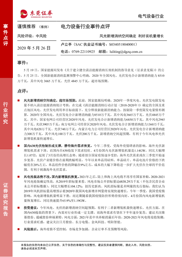 【东莞证券】【20200526】电力设备行业事件点评:风光新增消纳空间确定 利好装机量增长-2页