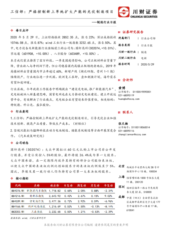 【川财证券】【20200529】制造行业日报:工信部:严格控制新上单纯扩大产能的光伏制造项目-3页