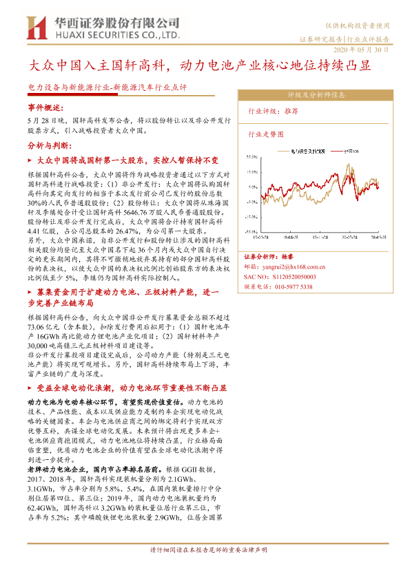 【华西证券】【20200530】电力设备与新能源行业-新能源汽车行业点评:大众中国入主国轩高科,动力电池产业核心地位持续凸显-4页