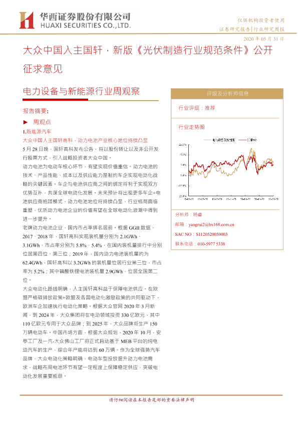 【华西证券】【20200531】电力设备与新能源行业周观察:大众中国入主国轩,新版《光伏制造行业规范条件》公开征求意见-19页