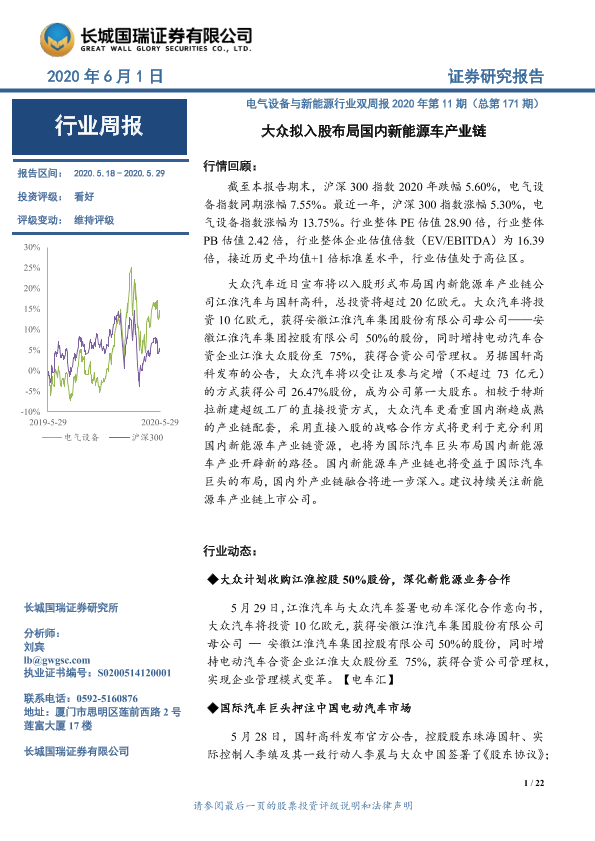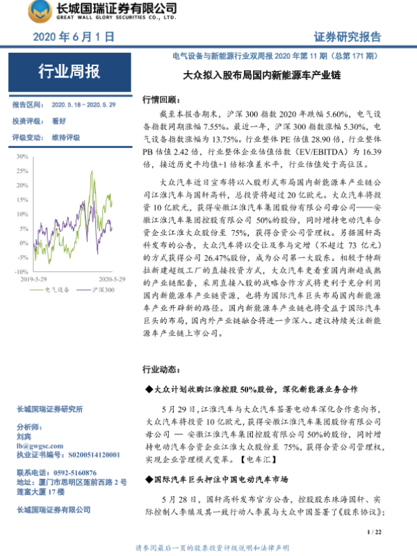【长城国瑞证券】【20200601】电气设备与新能源行业双周报2020年第11期(总第171期):大众拟入股布局国内新能源车产业链-22页