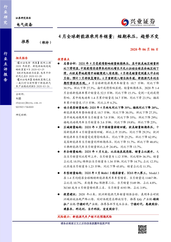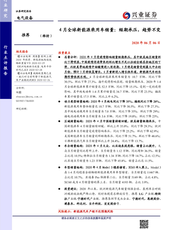 【兴业证券】【20200606】4月全球新能源乘用车销量:短期承压,趋势不变-10页