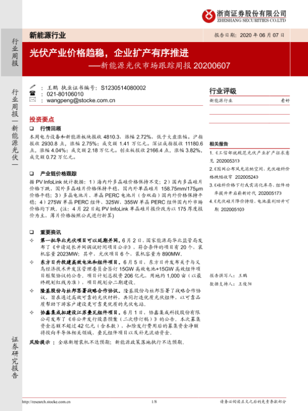 【浙商证券】【20200607】20200607-浙商证券-新能源光伏市场跟踪周报:光伏产业价格趋稳,企业扩产有序推进-8页