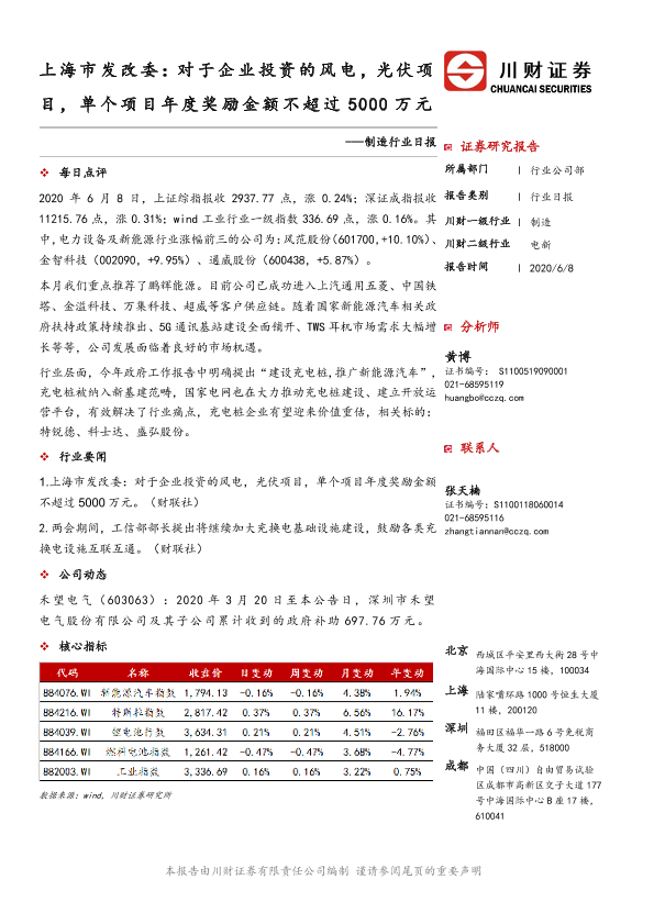 【川财证券】【20200608】制造行业日报:上海市发改委:对于企业投资的风电,光伏项目,单个项目年度奖励金额不超过5000万元-3页