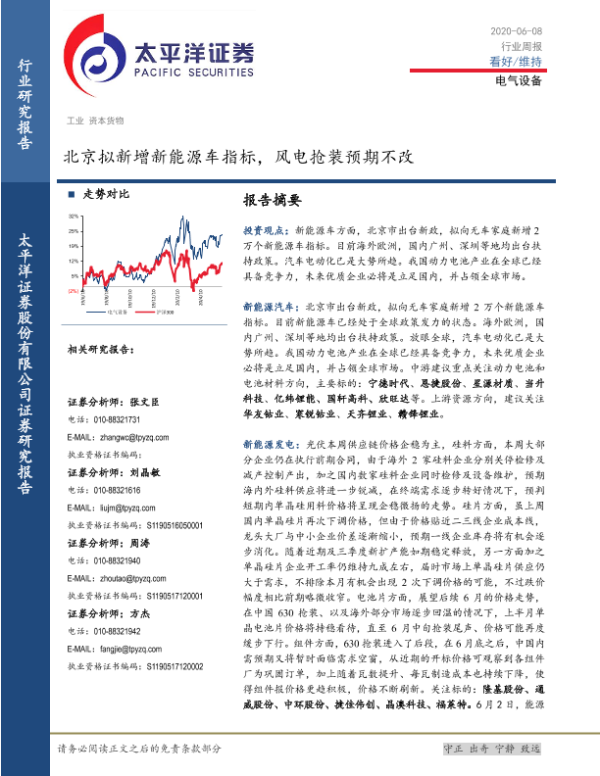 【太平洋证券】【20200608】20200608-太平洋-电气设备行业周报:北京拟新增新能源车指标,风电抢装预期不改-17页