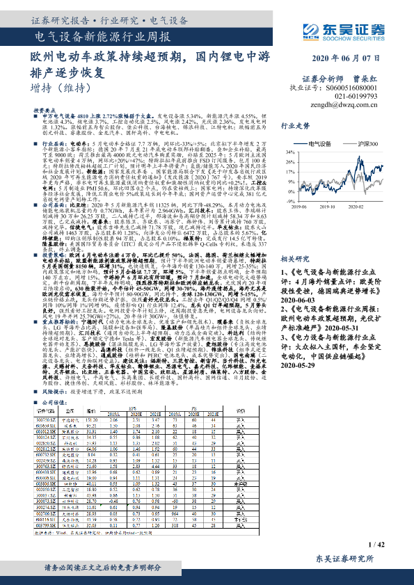 【东吴证券】【20200607】电气设备新能源行业周报:欧州电动车政策持续超预期,国内锂电中游排产逐步恢复-42页