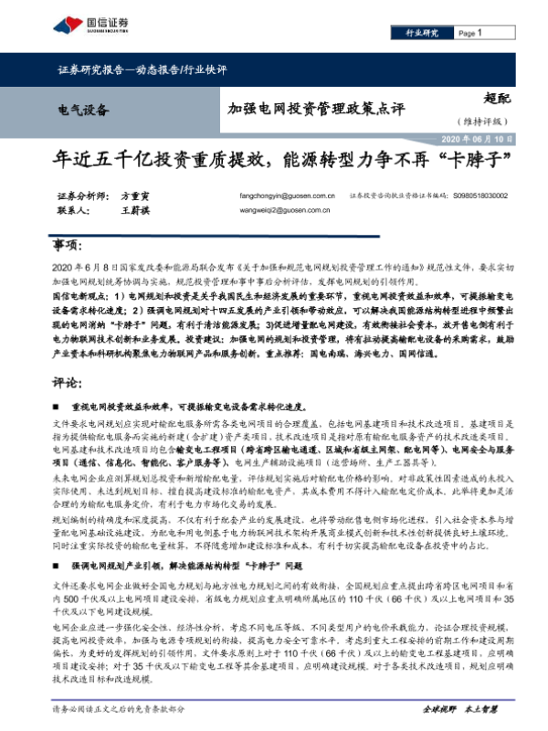 【国信证券】【20200610】加强电网投资管理政策点评:年近五千亿投资重质提效,能源转型力争不再“卡脖子”-5页