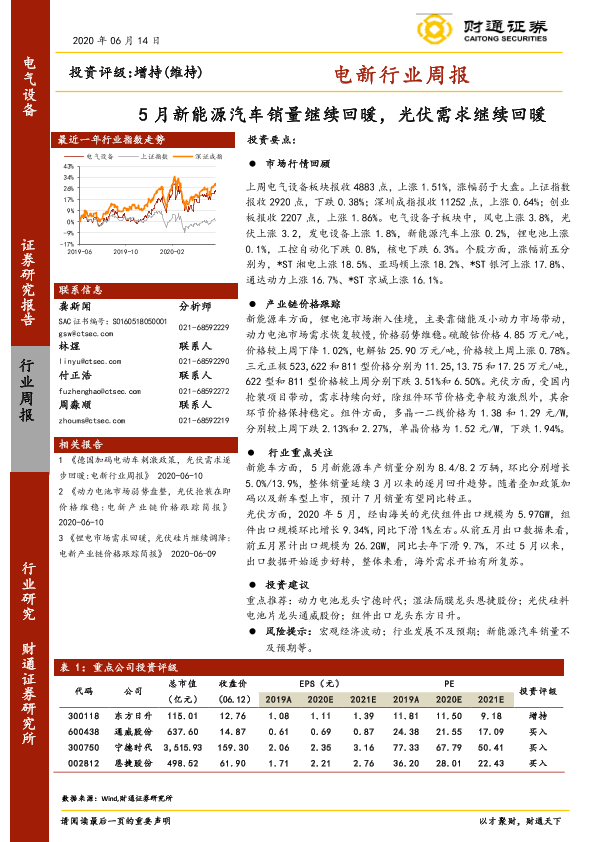 【财通证券】【20200614】20200614-财通证券-电新行业周报:5月新能源汽车销量继续回暖,光伏需求继续回暖-13页
