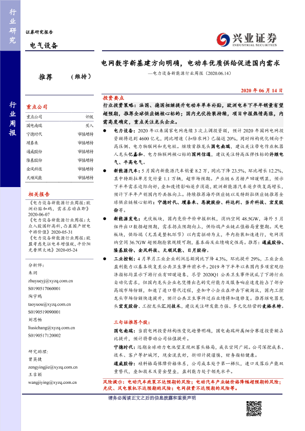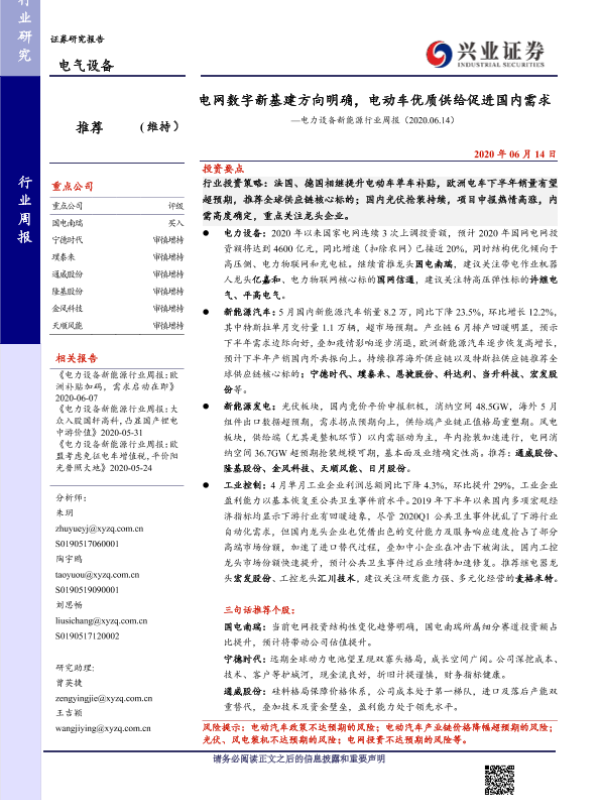 【兴业证券】【20200614】电网数字新基建方向明确,电动车优质供给促进国内需求—电力设备新能源行业周报(2020.06.14)-28页