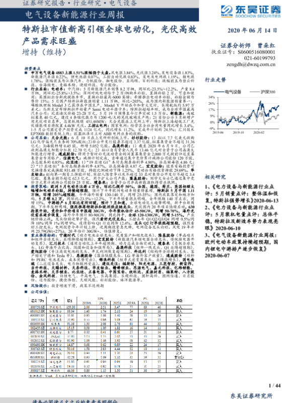 【东吴证券】【20200614】电气设备新能源行业周报:特斯拉市值新高引领全球电动化,光伏高效产品需求旺盛-44页