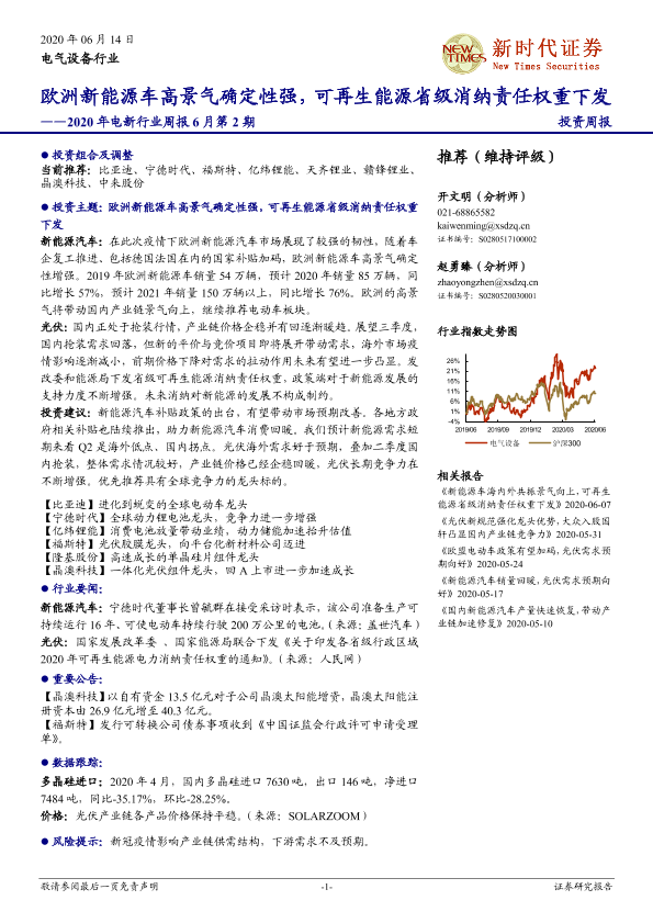 【新时代证券】【20200614】2020年电新行业周报6月第2期:欧洲新能源车高景气确定性强,可再生能源省级消纳责任权重下发-13页