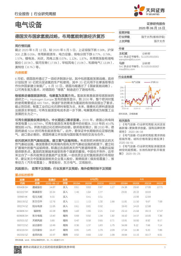 【天风证券】【20200615】电气设备行业研究周报:德国发布国家氢能战略,布局氢能刺激经济复苏-17页