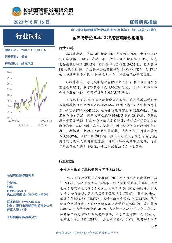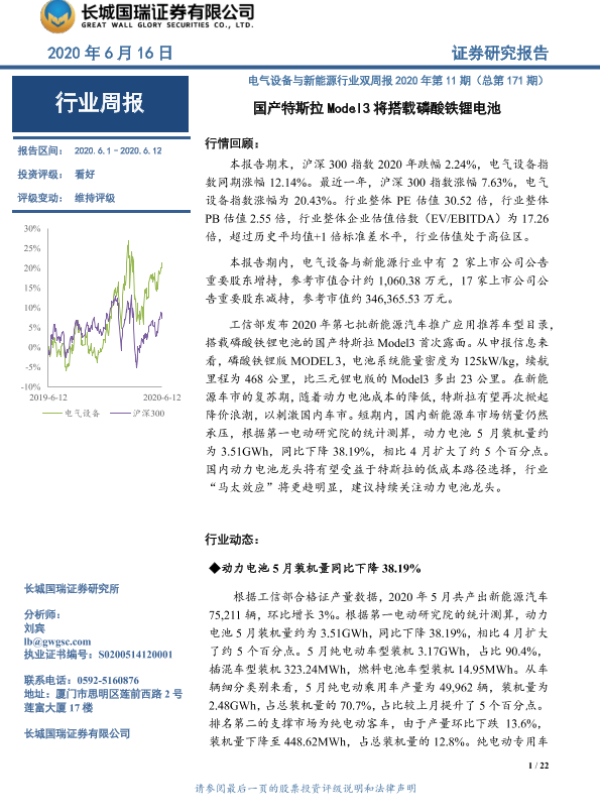 【长城国瑞证券】【20200616】电气设备与新能源行业双周报2020年第11期(总第171期):国产特斯拉Model3将搭载磷酸铁锂电池-22页