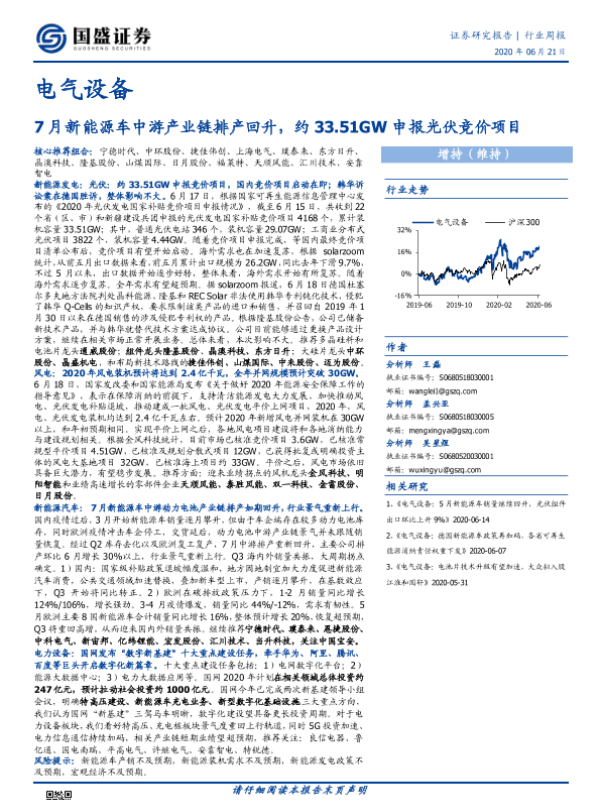 【国盛证券】【20200621】电气设备行业周报:7月新能源车中游产业链排产回升,约33.51GW申报光伏竞价项目-15页