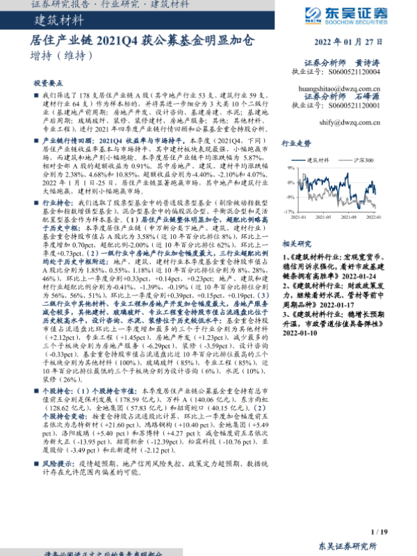 【东吴证券】【20220127】建筑材料行业:居住产业链2021Q4获公募基金明显加仓-19页