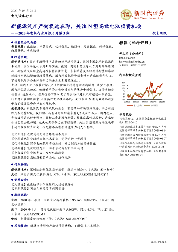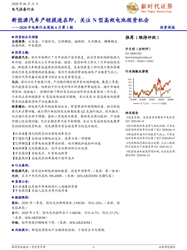 【新时代证券】【20200621】2020年电新行业周报6月第3期:新能源汽车产销提速在即,关注N型高效电池投资机会-14页